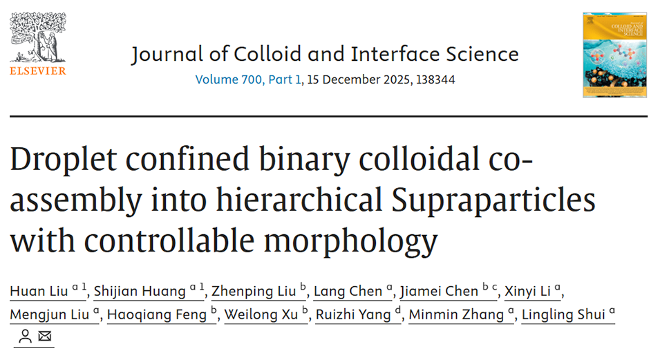 近期,华南师范大学水玲玲教授团队通过微流控技术,实现了聚苯乙烯纳米粒子与碳纳米管的二元胶体在液滴中的限域共组装,成功制备出多种形貌可控且结构多样的层级超颗粒。研究揭示了胶体粒径、组分比例及溶剂去除动力学对超颗粒结构形成的关键影响,并进一步拓展了该方法在磁响应功能超颗粒制备中的应用。相关研究以“Droplet confined binary colloidal co-assembly into hierarchical Supraparticles with controllable morphology”为题目,发表在期刊《Journal of Colloid and Interface Science》上。