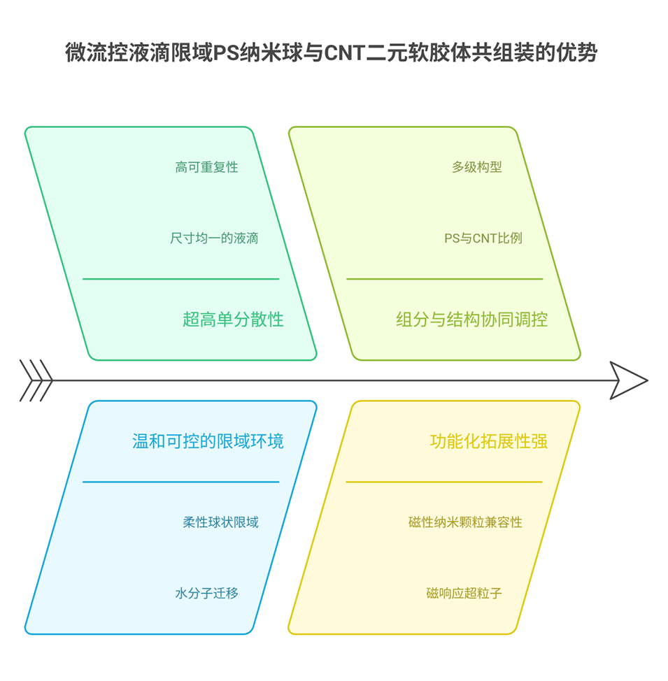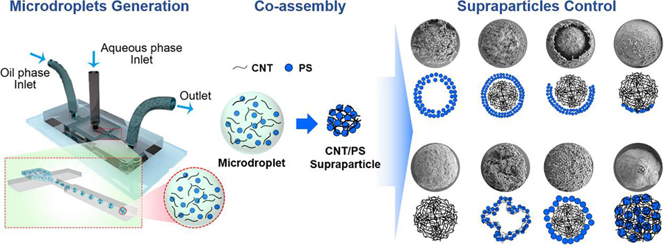 1、本文系统研究了利用微流控油包水乳液液滴作为软模板,实现球形聚苯乙烯纳米颗粒(PS)与线状碳纳米管(CNT)二元胶体的受限共组装,制备形态可调的层级超粒子。