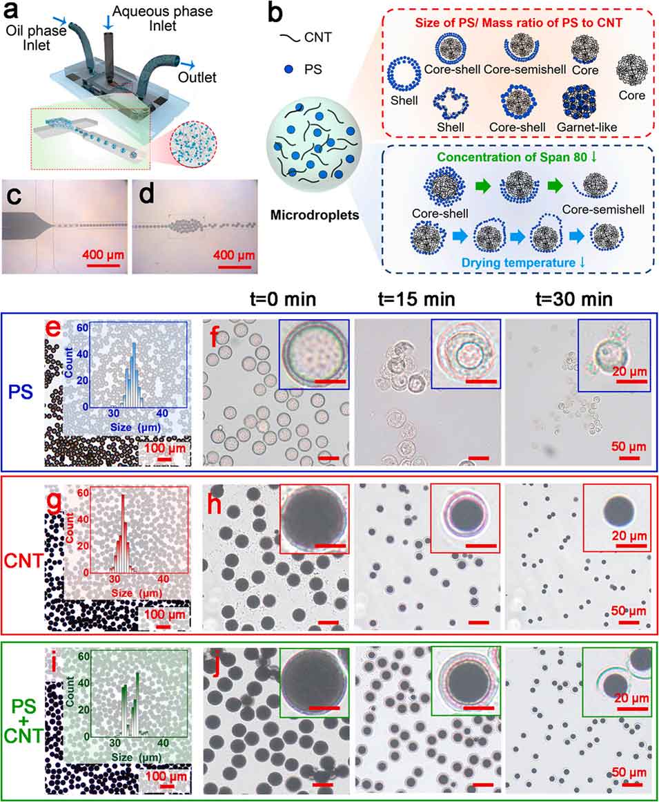 图1 (a) 用于液滴制备的微流控装置示意图。(b) 液滴限域 CNT/PS 复合超颗粒的典型结构示意图。(c) 流动聚焦交汇处液滴生成的光学图像。(d) 下游带缓冲储液池区域所得液滴的光学图像。(e、f) 内相为 PS 分散液、(g、h) 内相为 CNT 分散液、(i、j) 内相为 PS 与 CNT 混合分散液的所制液滴光学图像;插图为对应粒径分布,展示微滴随时间逐渐收缩的过程。