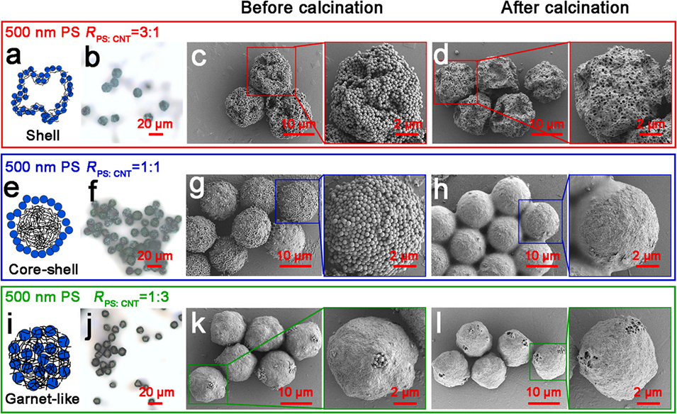 图3 不同RPS:CNT 的 500 nm PS 与 CNT 经液滴限域共组装制备的 CNT/PS 超颗粒。(a) 悬浮于乙醇中的 CNT/PS 超颗粒示意图与 (b) 光学图像。RPS:CNT 为 3:1 时,(c) 干燥态与 (d) 煅烧后 CNT/PS 超颗粒的 SEM 图像。(e) 悬浮于乙醇中的 CNT/PS 超颗粒示意图与 (f) 光学图像。RPS:CNT 为 1:1 时,(g) 干燥态与 (h) 煅烧后 CNT/PS 超颗粒的 SEM 图像。(i) 悬浮于乙醇中的 CNT/PS 超颗粒示意图与 (j) 光学图像。RPS:CNT 为 1:3 时,(k) 干燥态与 (l) 煅烧后 CNT/PS 超颗粒的 SEM 图像。
