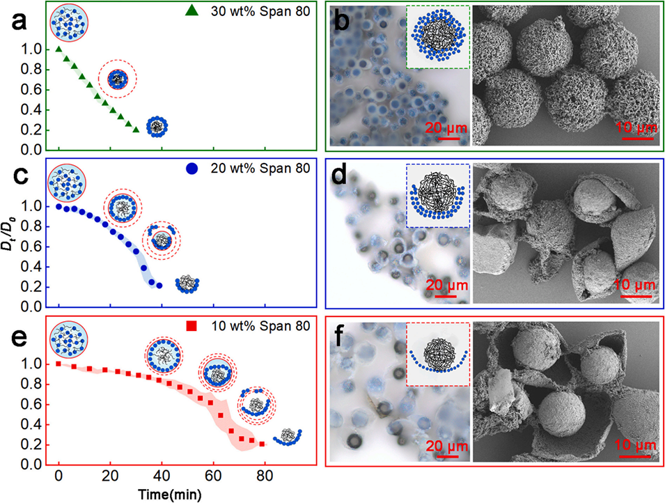 图5 Span 80 浓度对 CNT/PS 超颗粒固化速率及所得结构的影响。(a) Span 80 浓度为 30 wt% 时测得的收缩率(实时液滴尺寸与初始尺寸之比,Dt/D0),以及 (b) 最终阶段所得对应煅烧后 CNT/PS 超颗粒的光学与 SEM 图像;插图为共组装过程与结构示意图。(c) Span 80 浓度为 20 wt% 时测得的收缩率,以及 (d) 最终阶段所得对应煅烧后 CNT/PS 超颗粒的光学与 SEM 图像;插图为共组装过程与结构示意图。(e) Span 80 浓度为 10 wt% 时测得的收缩率,以及 (f) 最终阶段所得对应煅烧后 CNT/PS 超颗粒的光学与 SEM 图像;插图为共组装过程与结构示意图。本实验中dPS =100 nm,RPS:CNT =1:1。彩色条纹误差棒代表 50 个随机选取液滴收缩率的标准偏差(SD)。