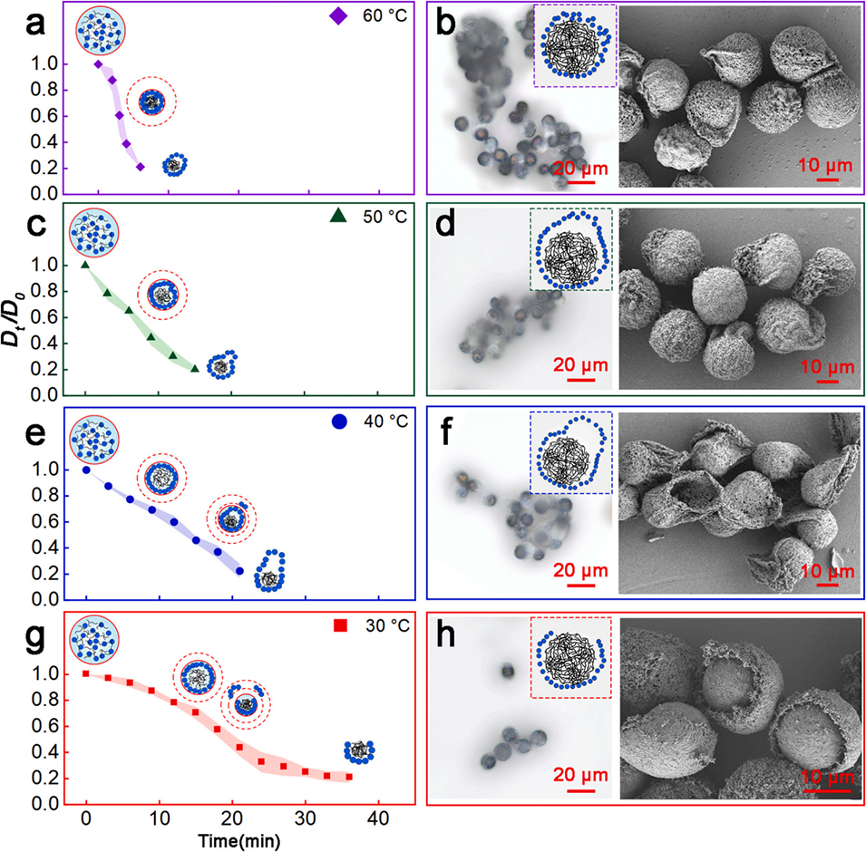 图6 干燥温度对 CNT/PS 超颗粒固化速率及所得结构的影响。(a) 干燥温度为 60 ℃时测得的收缩率(Dt/D0),以及 (b) 最终阶段所得对应煅烧后 CNT/PS 超颗粒的光学与 SEM 图像;插图为共组装过程与结构示意图。(c) 干燥温度为 50 ℃时测得的收缩率,以及 (d) 最终阶段所得对应煅烧后 CNT/PS 超颗粒的光学与 SEM 图像;插图为共组装过程与结构示意图。(e) 干燥温度为 40 ℃时测得的收缩率,以及 (f) 最终阶段所得对应煅烧后 CNT/PS 超颗粒的光学与 SEM 图像;插图为共组装过程与结构示意图。(g) 干燥温度为 30 ℃时测得的收缩率,以及 (h) 最终阶段所得对应煅烧后 CNT/PS 超颗粒的光学与 SEM 图像;插图为共组装过程与结构示意图。本实验中dPS =100 nm,RPS:CNT =1:1。彩色条纹误差棒代表 50 个随机选取液滴收缩率的标准偏差(SD)。