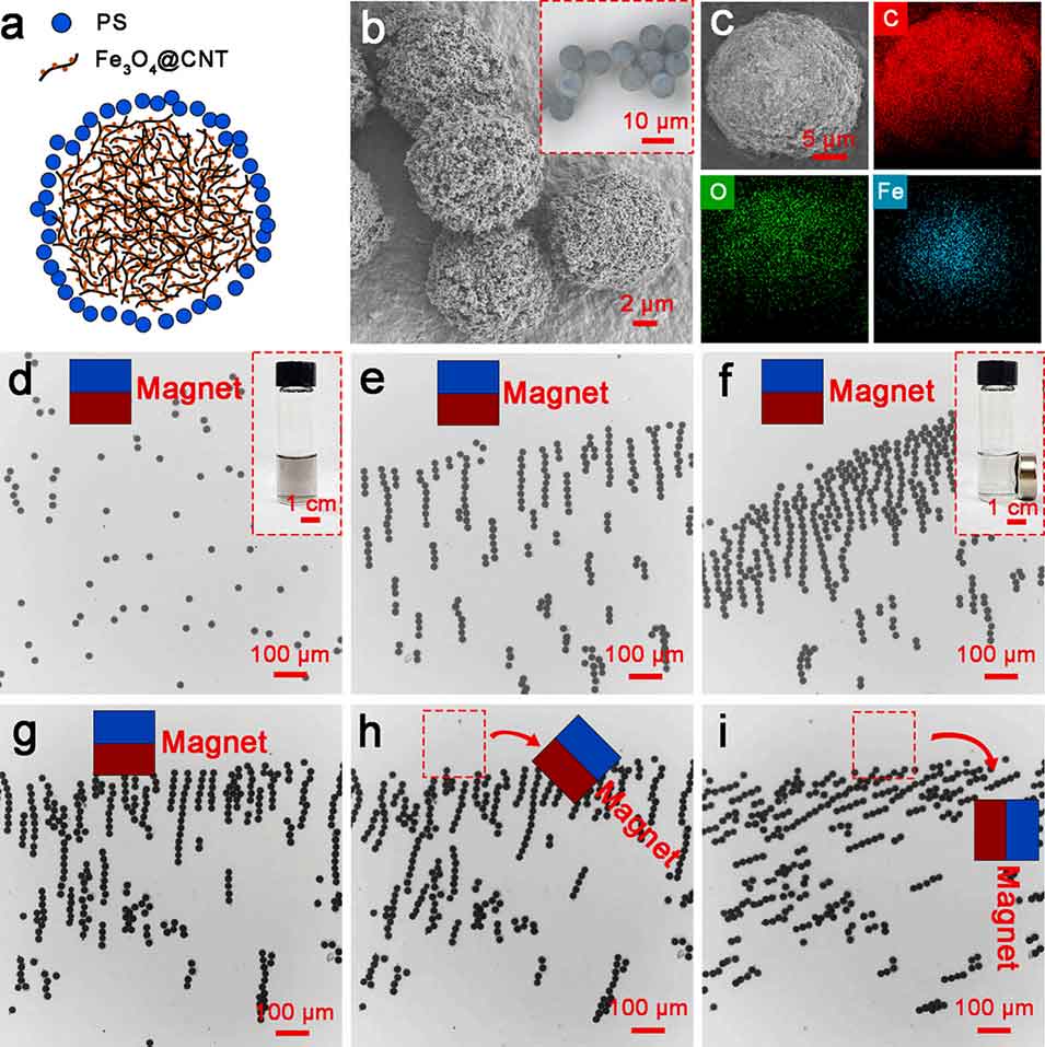 图7 (a) 核-壳型 PS/Fe3O4@CNT 超颗粒示意图。(b) 核-壳型 PS/Fe3O4@CNT 超颗粒的 SEM 图像,插图为其光学图像。(c) 超颗粒上碳(C)、氧(O)、铁(Fe)的 EDS 元素面分布图。(d–f) PS/Fe3O4@CNT 超颗粒随静态磁铁位置与取向移动并定向排列;(d) 插图为超颗粒悬浮液照片,(f) 插图为磁力收集超颗粒照片。(g–i) PS/Fe3O4@CNT 超颗粒形成链状并随磁场取向旋转。