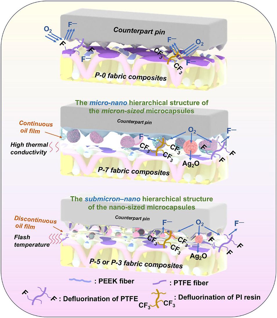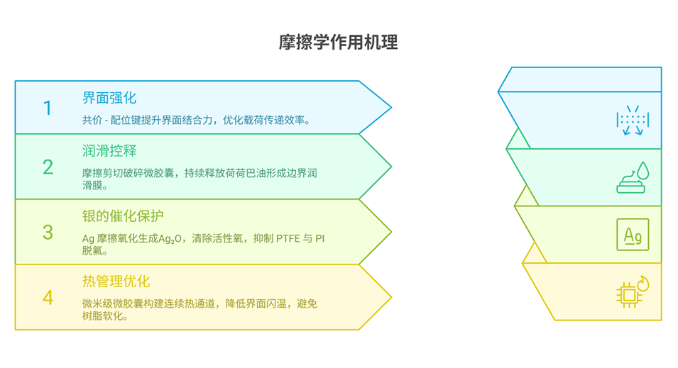 协同保护作用:释放出的银纳米粒子在摩擦界面发生氧化,生成的Ag₂O 能够清除活性氧物种,从而抑制 PTFE 纤维和 PI 树脂的脱氟降解。