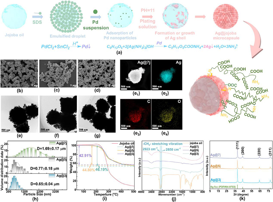 图1 (a) 银包覆荷荷巴油微胶囊的合成流程及微胶囊与树脂间相互作用的示意图;(b) Ag@7j 微胶囊、(c) Ag@5j 微胶囊、(d) Ag@3j 微胶囊的扫描电镜图像;(e) Ag@7j 微胶囊、(f) Ag@5j 微胶囊、(g) Ag@3j 微胶囊的高角环形暗场-扫描透射电镜图像;(e₁)–(e₄) Ag@7j 微胶囊的高角环形暗场-扫描透射电镜图像及对应元素分布图;(h) 微胶囊尺寸分布直方图;(i) 荷荷巴油与微胶囊的热重分析曲线;(j) 荷荷巴油与微胶囊的傅里叶变换红外光谱;(k) 银包覆荷荷巴油微胶囊的 X 射线衍射图谱。
