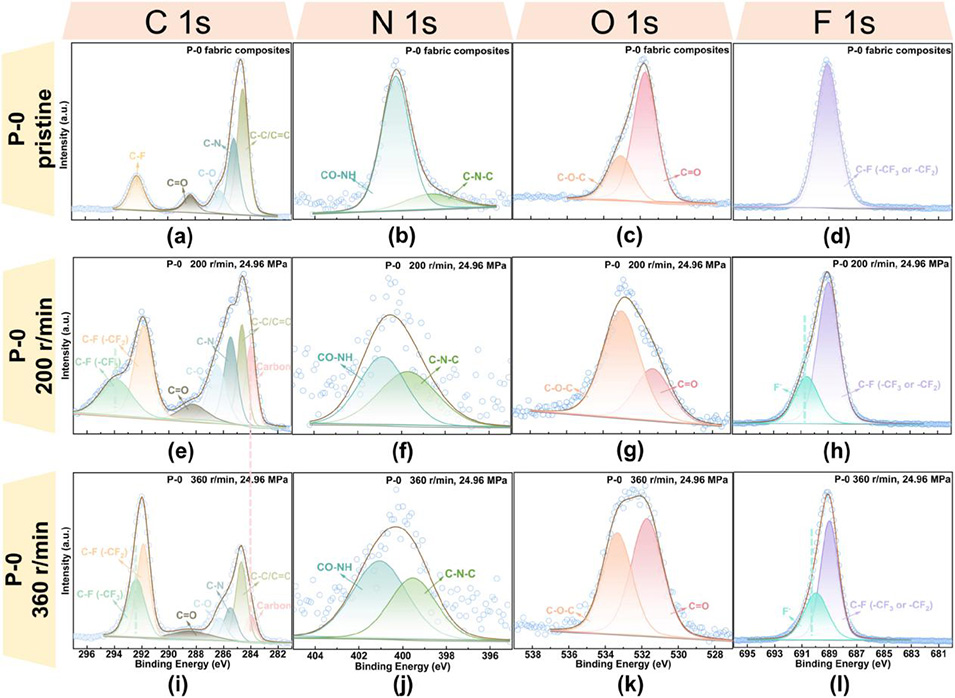 图4 (a)–(d) 纯 P-0 织物复合材料的 C 1s、N 1s、O 1s、F 1s 高分辨 X 射线光电子能谱;(e)–(h) 200 转/分钟下 P-0 的磨损表面高分辨 X 射线光电子能谱;(i)–(l) 360 转/分钟下 P-0 的磨损表面高分辨 X 射线光电子能谱。