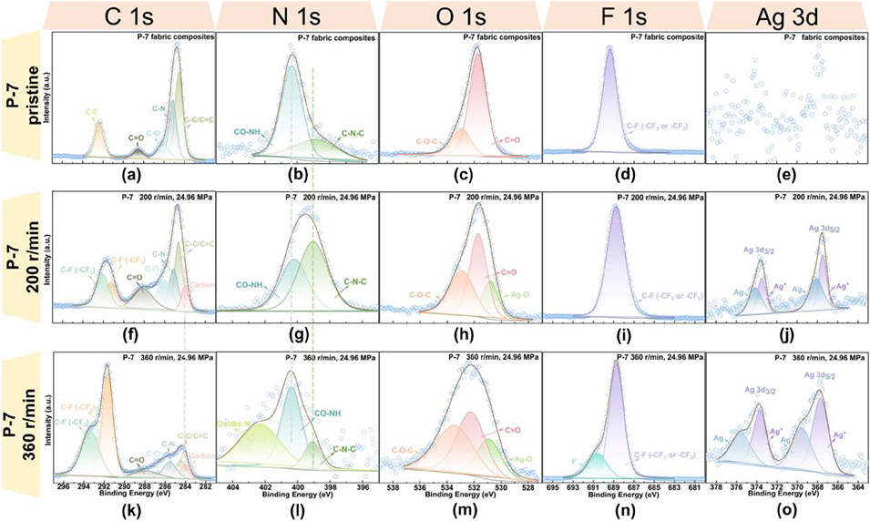 图5 (a)–(e) 纯 P-7 织物复合材料的 C 1s、N 1s、O 1s、F 1s、Ag 3d 高分辨 X 射线光电子能谱;(f)–(j) 200 转/分钟下 P-7 的磨损表面高分辨 X 射线光电子能谱;(k)–(o) 360 转/分钟下 P-7 的磨损表面高分辨 X 射线光电子能谱。