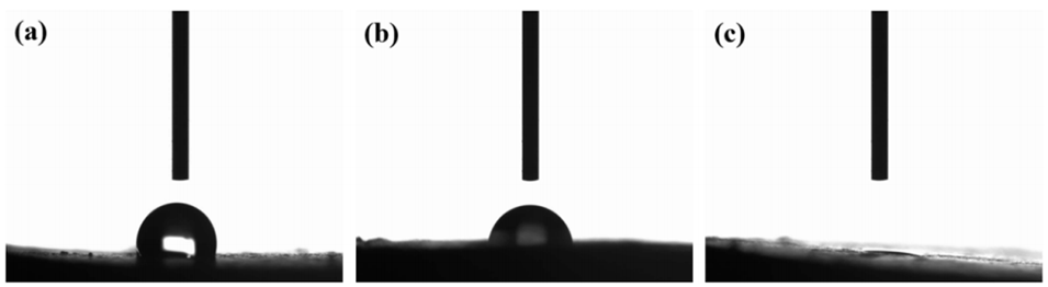 图3 接触角分析的水滴图像,对应以下三种材料的表面:(a) 纯 PCL,(b) AS/PCL 微球,(c) 壳聚糖包覆的 AS/PCL 微球