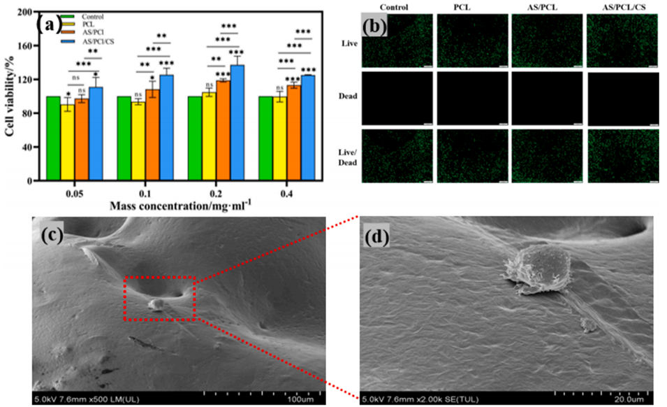 图5 (a) 细胞增殖率(n=3,单因素方差分析后进行 Tukey 事后检验,ns 表示无统计学差异;* 表示 p<0.05;** 表示 p<0.01;*** 表示 p<0.001);(b) 微球作用于 L929 成纤维细胞的活性结果图(4 倍放大);(c) L929 成纤维细胞黏附于 AS/PCL/CS 微球表面的扫描电镜图(标尺 = 100.0μm);(d) L929 成纤维细胞形态的扫描电镜图(标尺 = 20μm)