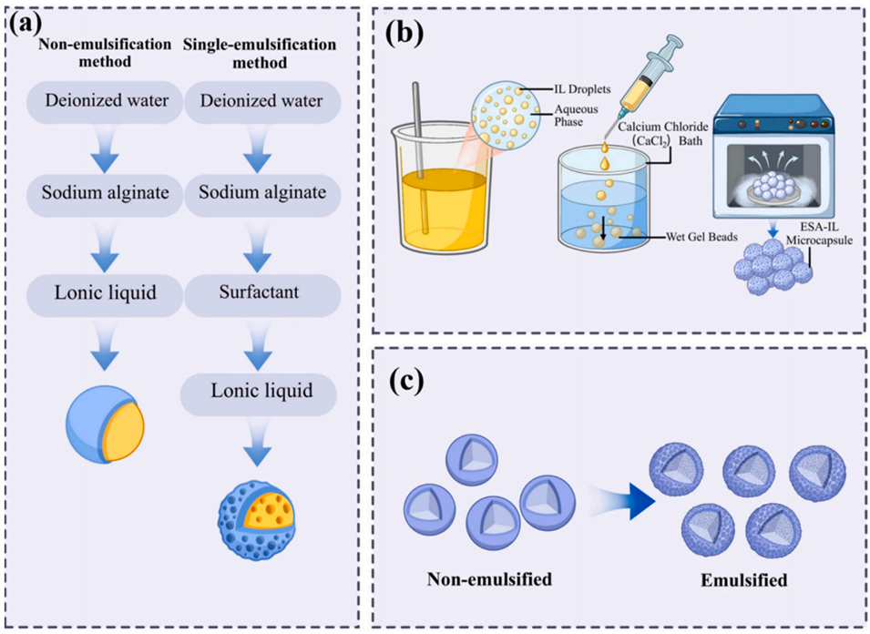 物理性质:结构分析确认离子液体 [BMIM][BF₄] 物理包封在无定形的藻酸盐网络中,且乳化步骤主要改变壳层微观结构,而非基础化学组成。