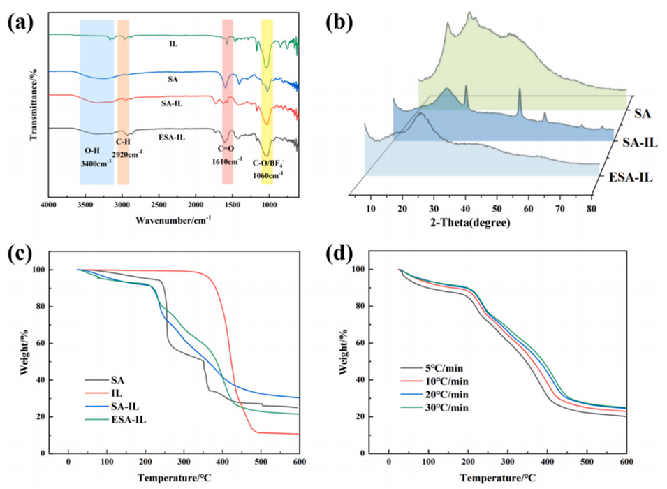 图3 海藻酸钠(SA)、离子液体(IL)、SA–IL 及 ESA–IL 微胶囊的光谱、结构与热性能表征。(a) IL、SA、SA–IL 与 ESA–IL 的傅里叶变换红外光谱,突出 O–H、C–H、羧基负离子(–COO⁻)及 C–O–C / 四氟硼酸根负离子(BF₄⁻)特征峰区;(b) SA、SA–IL 与 ESA–IL 的 X 射线衍射图谱,显示 SA 的无定形漫散峰、SA–IL 中的额外衍射峰,以及 ESA–IL 更强的无定形特征;(c) 氮气氛围下 SA、IL、SA–IL 与 ESA–IL 的热重曲线,表明其多步分解行为与最终残炭量差异;(d) 不同升温速率(5、10、20、30 ℃・min⁻¹)下 ESA–IL 的热重曲线,结果显示升温速率加快会使分解步骤向表观高温轻微偏移,但整体多步分解行为与最终残炭量保持不变。
