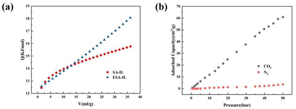 高选择性:ESA–IL 表现出显著的 CO₂/N₂ 分离倾向,在高压下 CO₂ 的摄取量比 N₂ 高出一个数量级以上。
