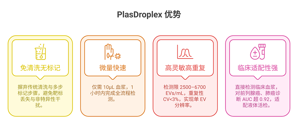 总结而言,PlasDroplex 为液态活检提供了一种低成本、高效率且易于操作的数字化检测方案,克服了传统 EV 分析中操作复杂、耗时长和灵敏度不足等挑战。
