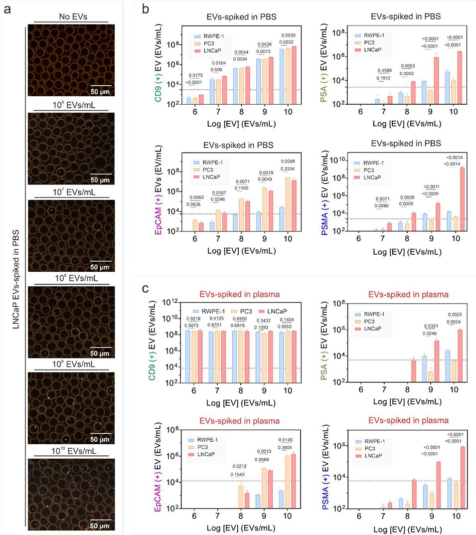 图3. 使用 PlasDroplex 分析对 PBS 和血浆中的 EV 生物标志物进行数字化检测。 (a) 暗场图像显示,随着掺入 PBS 中的 LNCaP 来源 EV 浓度升高(106–1010 EVs/mL),等离激元“开”液滴(圆圈标记)的数量随之增加。比例尺:50 μm。 (b) 对掺入 PBS 中的 CD9(+)、EpCAM(+)、PSA(+) 和 PSMA(+) EVs 的定量分析。CD9 作为广谱 EV 标志物,而相对于正常对照(RWPE-1),EpCAM、PSA 和 PSMA 在前列腺癌来源的 EVs(PC3、LNCaP)中富集。 (c) 对掺入血浆中的 EV 生物标志物的定量分析,基质效应降低了信号强度,但仍保留了标志物特异性的辨别能力。数据为平均值 ± 标准差 (n = 3);统计分析采用单因素方差分析及 Tukey 多重比较检验。