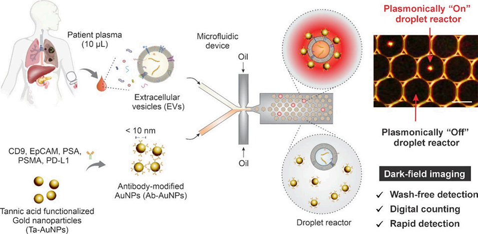 图1. 用于免清洗细胞外囊泡(EV)检测的 PlasDroplex 分析示意图。 将患者血浆(10 μL)与抗体功能化的金纳米颗粒混合,并分割封装至约 9 pL 的液滴(直径约 27 μm)中。EV 与金纳米颗粒(AuNP)的结合诱导了等离激元聚集,产生明亮的“开(On)”液滴,而无 EV 的液滴则保持黑暗,从而能够通过暗场成像实现快速、免清洗的数字化检测。