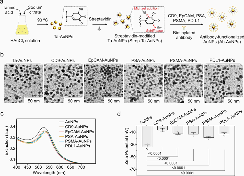 图2. 抗体功能化的金纳米颗粒(AuNPs)和细胞外囊泡(EVs)的制备与表征。 (a) 单宁酸还原的 AuNP 合成、链霉亲和素修饰以及与生物素化抗体(CD9、EpCAM、PSA、PSMA、PD-L1)偶联的示意图。 (b) 抗体功能化 AuNPs 的透射电子显微镜(TEM)图像。比例尺:50 nm。 (c) 紫外-可见(UV-vis)光谱显示抗体偶联后特征性的表面等离激元共振(LSPR)红移。 (d) Zeta 电位变化证实了表面功能化的成功。数据为平均值 ± 标准差 (n = 5);统计分析采用单因素方差分析(one-way ANOVA)及 Tukey 多重比较检验。
