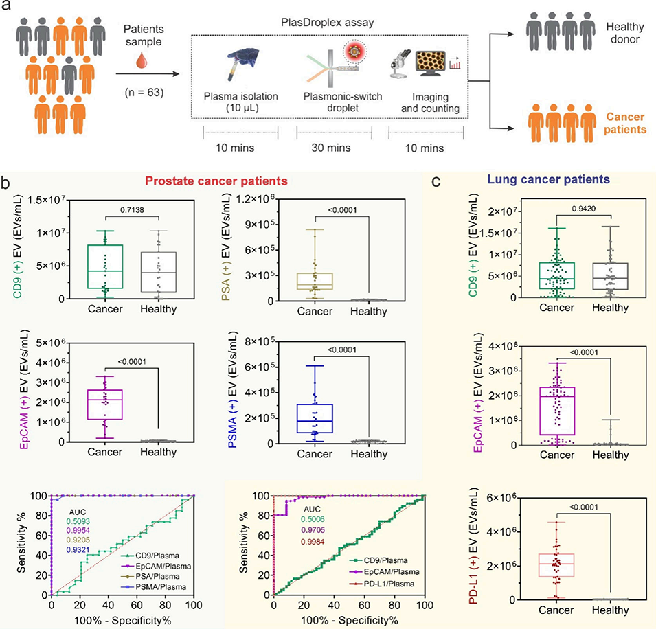 图4. 使用人类血浆样本(n = 63)对 PlasDroplex 分析进行临床验证。 (a) 临床验证的 PlasDroplex 工作流程,包括血浆处理、基于液滴的等离激元检测、成像和 1 小时内的数字化 EV 计数。 (b) 前列腺癌患者和健康捐赠者血浆中 CD9(+)、EpCAM(+)、PSA(+) 和 PSMA(+) EVs 的定量。CD9 水平相当,而 EpCAM、PSA 和 PSMA 在患者中显著升高。ROC 分析得出的 AUC 值分别为 0.926 (PSA) 和 0.932 (PSMA)。 (c) 来自肺癌患者(n = 26)和健康捐赠者(n = 20)血浆样本中 CD9(+)、EpCAM(+) 和 PD-L1(+) EVs 的定量,其中 PD-L1 的 AUC 达到 0.998。数据为平均值 ± 标准差;显著性通过双尾非配对 Student t 检验确定。