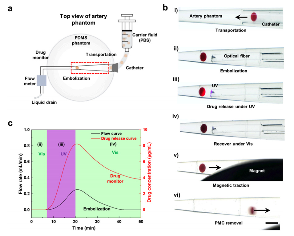 在栓塞治疗方面,光开关微胶囊可用于经导管动脉化疗栓塞(TACE)。它们具有快速栓塞、高载药量、精确给药和磁共振成像等功能,而且可生物降解和拆卸。此外,包裹有磁性纳米颗粒的磁性微囊可在栓塞后用于磁共振成像,以防止经导管部署过程中发生异位栓塞。此外,在栓塞和灭活肿瘤细胞后,微胶囊可在磁场作用下被移除,即使未被移除的微胶囊预计也会被生物降解。这种方法可以将高浓度的化疗药物输送到肿瘤,而不会增加全身浓度,促进肿瘤缺血和坏死。因此,光开关微胶囊有望为个性化给药和栓塞治疗提供一种新方法。