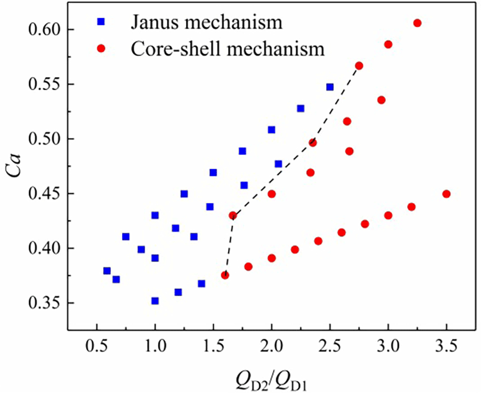 3、发现在液滴形成过程中,流体动力学和热力学过程之间的竞争导致了Janus机制和核壳机制之间的相互转变。