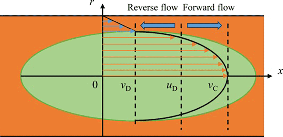 图7.微通道中的速度分布。vD表示液滴界面的速度,uD表示液滴内部的平均速度,vC表示液滴轴上的速度。