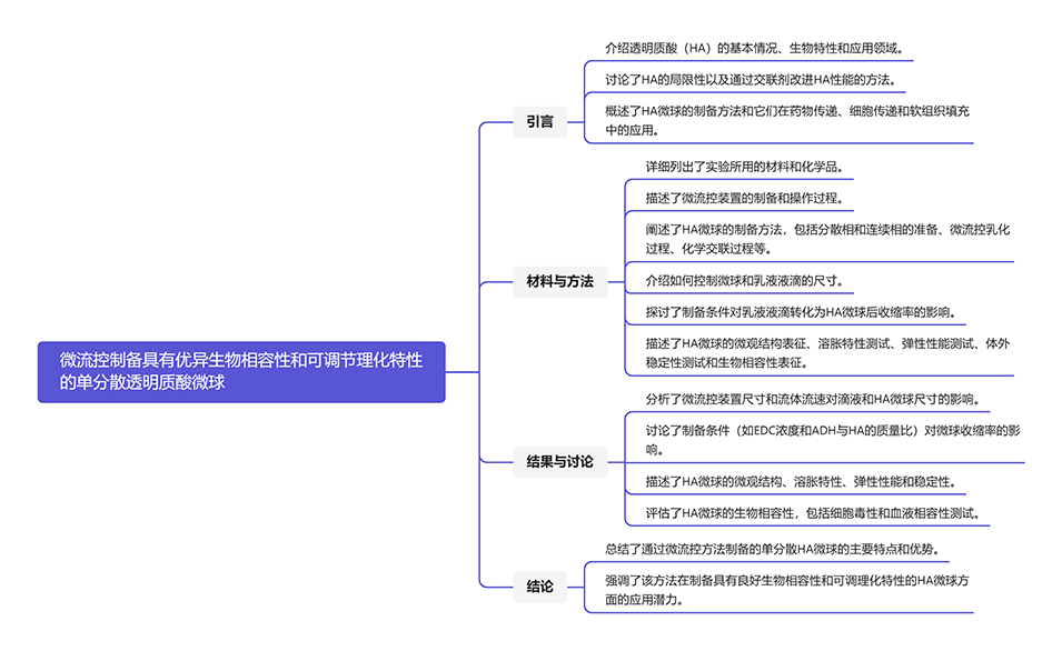 1、本研究开发了一种基于液滴微流控的简单而高效的方法,用于可控制备具有优异生物相容性和可调理化特性的单分散透明质酸(HA)微球。