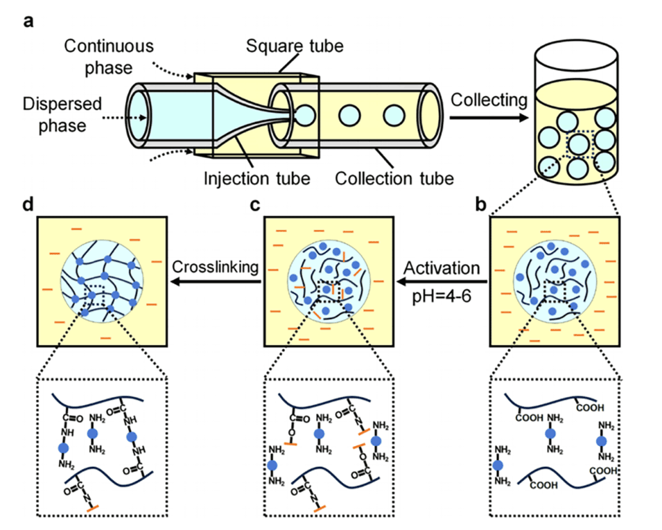 2、通过在HA分散相中使用己二酸二酰肼(ADH)作为交联剂,在收集液中使用1-乙基-3-(3-二甲基氨基丙基)碳二亚胺盐酸盐(EDC)作为活化剂,以微流控乳液液滴为模板,一步即可高效获得尺寸均匀、生物相容性优异的化学交联透明质酸微球。