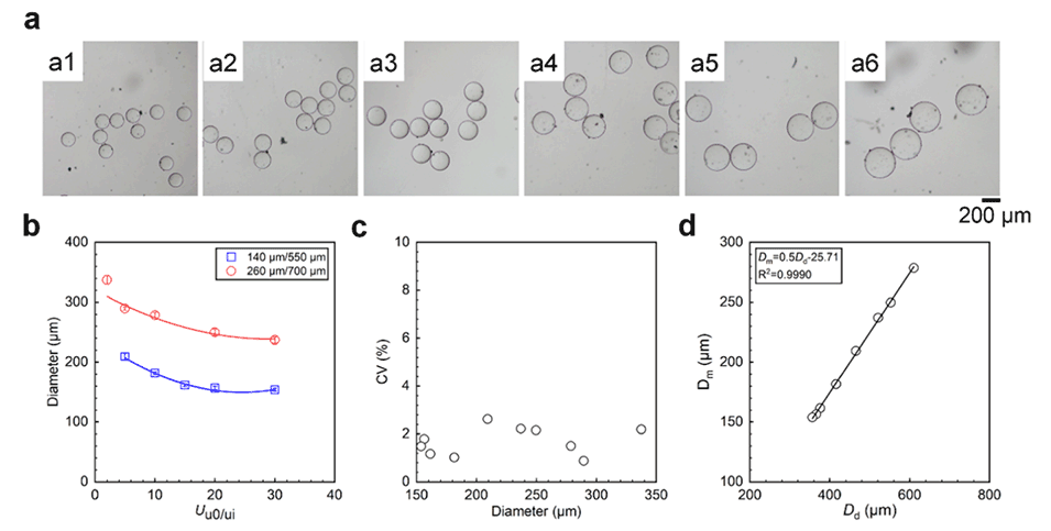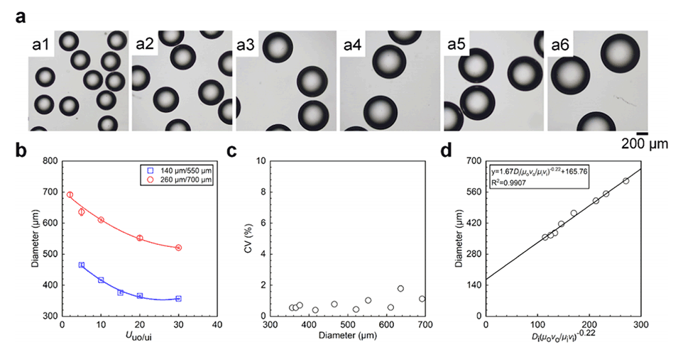 图2.微流控装置的尺寸以及内外相流体的流速对液滴尺寸的影响。