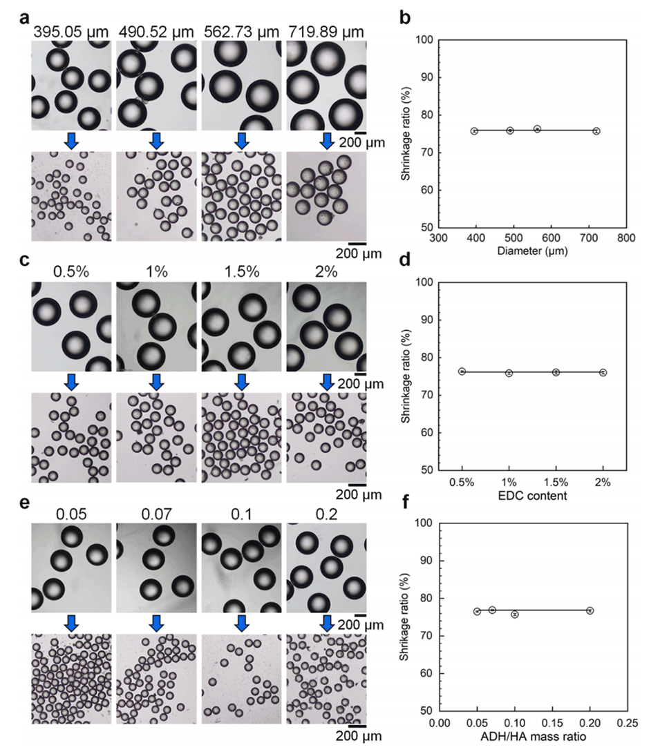 图4.液滴尺寸(a,b)、EDC浓度(c,d)以及ADH与HA的质量比(e,f)对转化为微球后液滴收缩率的影响。(a,c,e)液滴(上排)和相应生成的微球(下排)的光学图像。(b,d,f)定量关系。