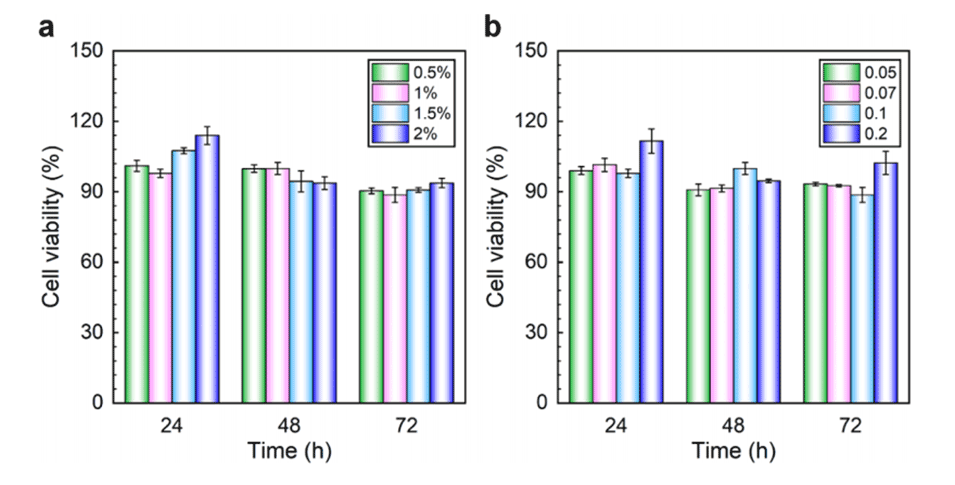 图10.以不同EDC浓度(a)和不同ADH与HA质量比(b)制备的HA微球在与L929细胞孵育24、48和72小时后的细胞存活率。