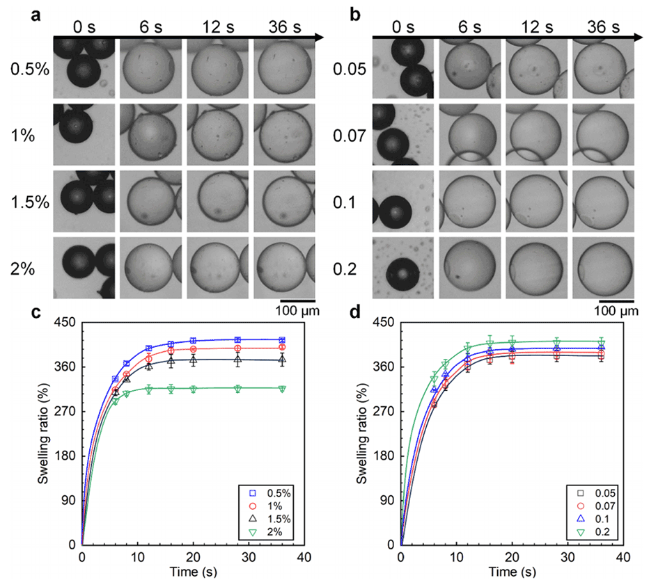图6.(a,b)以0.5%、1%、1.5%和2%的EDC浓度制备的干燥HA微球的溶胀过程的光学显微照片(a),以及以0.05、0.07、0.1、0.2的ADH与HA的质量比制备的干燥HA微球在生理盐水溶液中于不同时间间隔下的溶胀过程。(c,d)EDC浓度(c)和ADH与HA的质量比(d)对HA微球在生理盐水溶液中的溶胀率的影响。
