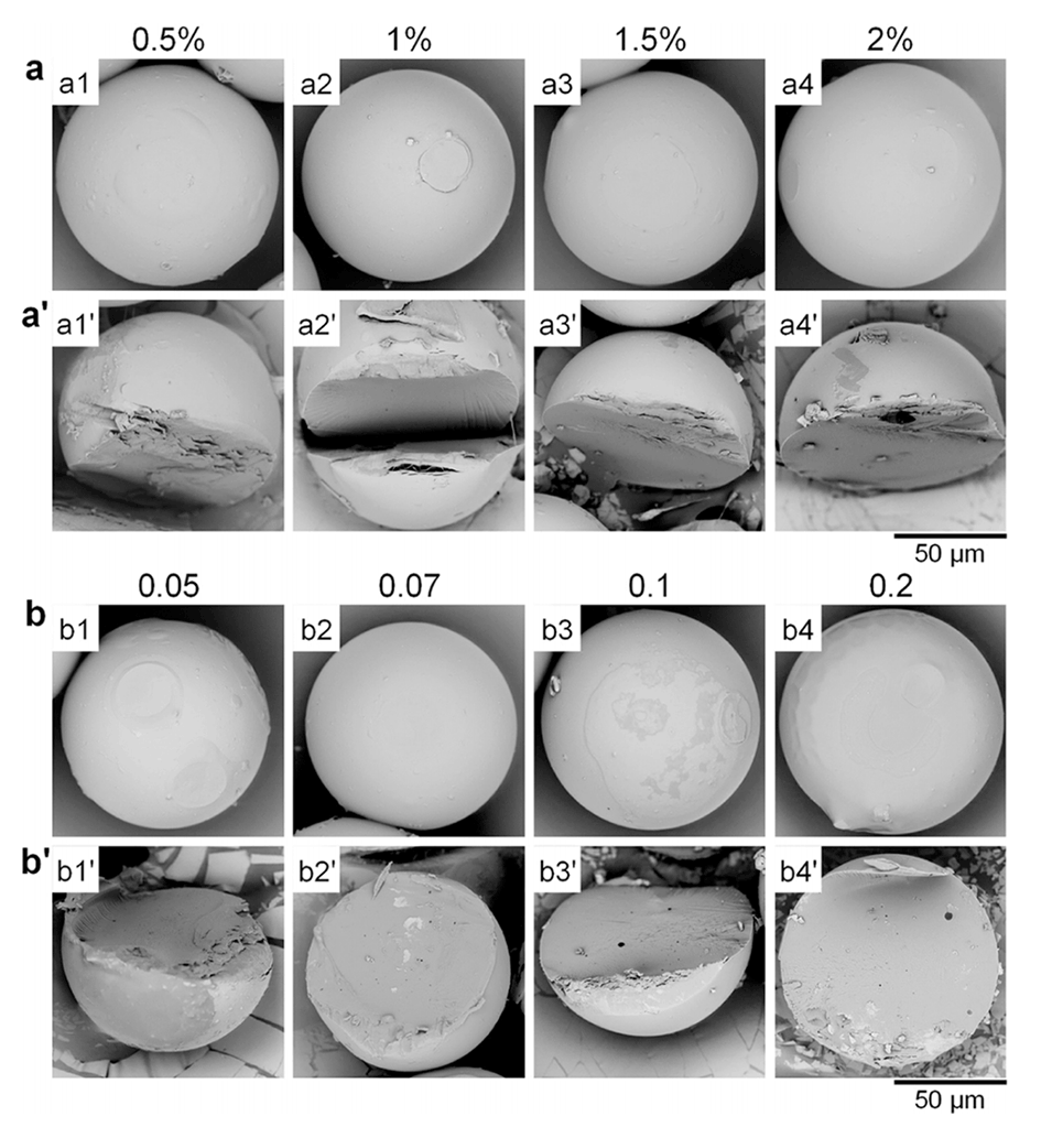 图5.在不同EDC浓度(a,a′)和不同ADH与HA质量比(b,b′)下制备的HA微球的表面(a,b)和横截面(a′,b′)的SEM图像。(a1,a1′)0.5%,(a2,a2′)1%,(a3,a3′)1.5%,(a4,a4′)2%。(b1,b1′)0.05,(b2,b2′)0.07,(b3,b3′)0.1,(b4,b4′)0.2。