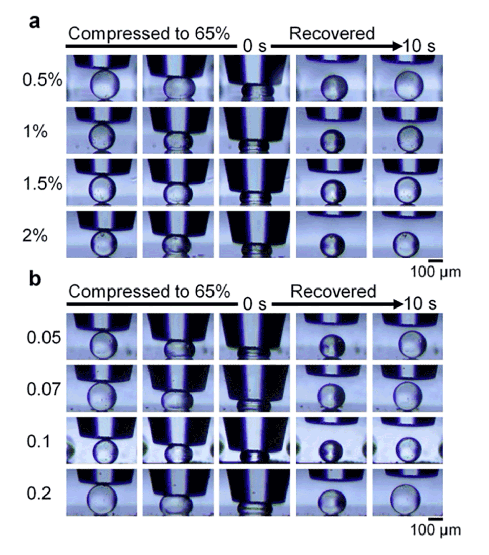 图7.在不同EDC浓度(a)和不同ADH与HA质量比(b)下制备的HA微球的压缩和恢复过程的光学图像。