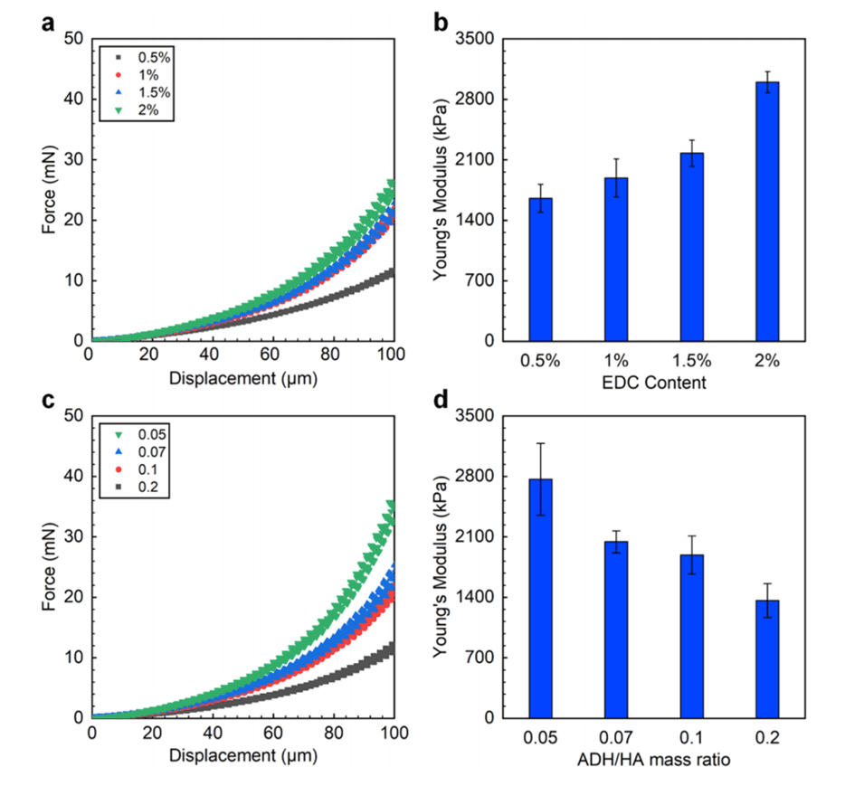 图8.(a,c)在不同EDC浓度(a)和不同ADH与HA质量比(c)下制备的HA微球的力-位移曲线。(b,d)EDC浓度(b)和ADH与HA的质量比(d)对HA微球的杨氏模量的影响。