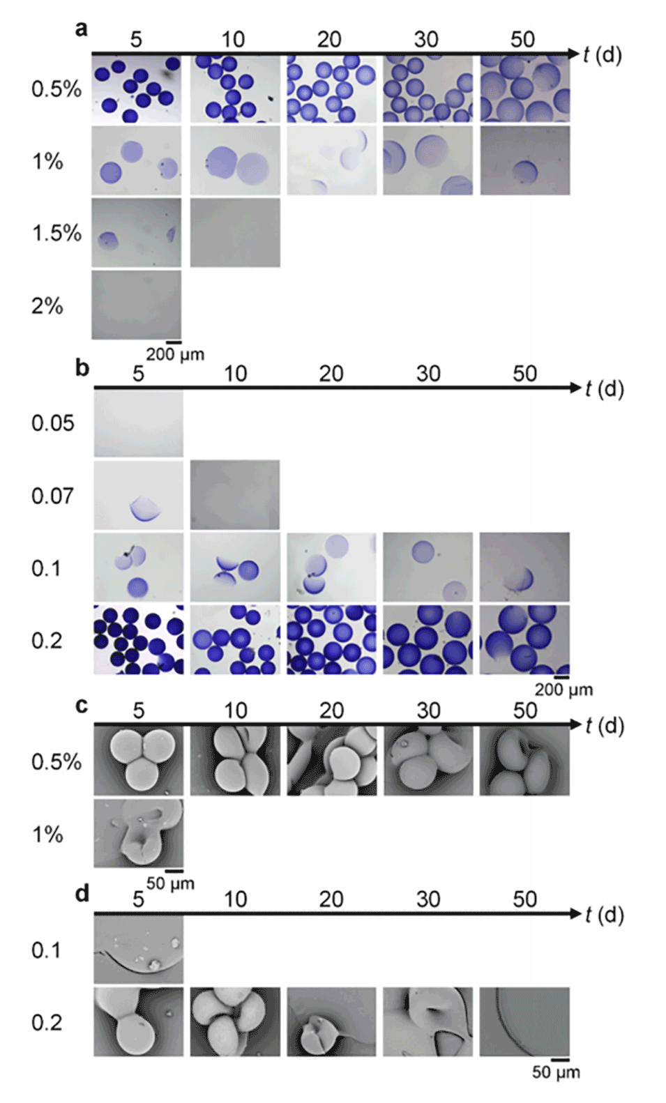 图9.以不同EDC浓度(a,c)和不同ADH与HA质量比(b,d)制备的HA微球在PBS中孵育5、10、20、30和50天的光学(a,b)和SEM(c,d)图像。