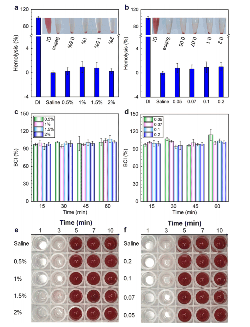 图11.EDC浓度(a,c,e)和ADH与HA的质量比(b,d,f)对HA微球的溶血率(a,b)、凝血指数(c,d),以及在1、3、5、7和10分钟观察到的凝血情况(e,f)的影响。