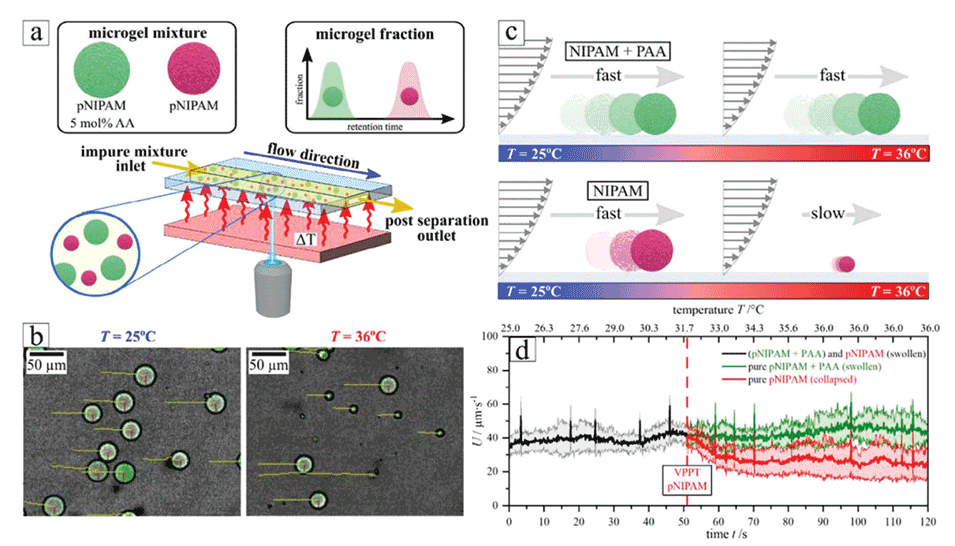 2、分离原理基于热响应微凝胶在加热过程中发生体积相变,从而改变其尺寸和在剪切流中的漂移速度。