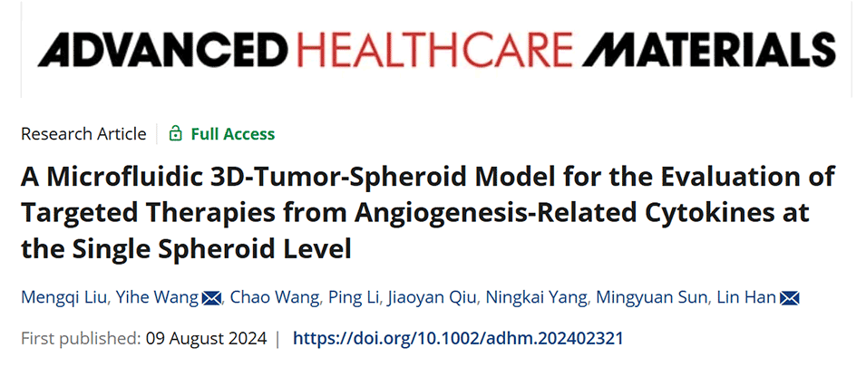 近期,山东大学韩琳教授、王一鹤博士等人开发了一种高通量的微流控平台,能够在单个多细胞肿瘤球(MTS)水平上,对细胞因子分泌与药物治疗之间的关系进行精确评估,为癌症治疗研究提供了新的视角和工具。相关研究以“A Microfluidic 3D-Tumor-Spheroid Model for the Evaluation of Targeted Therapies from Angiogenesis-Related Cytokines at the Single Spheroid Level”为题目,发表在期刊《Advanced Healthcare Materials》上。