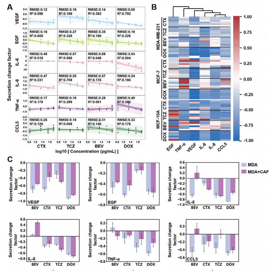 2、利用该平台,研究了三阴性乳腺癌细胞株MDA-MB-231在不同靶向药物和化疗药物处理下的细胞活性和分泌细胞因子的变化。