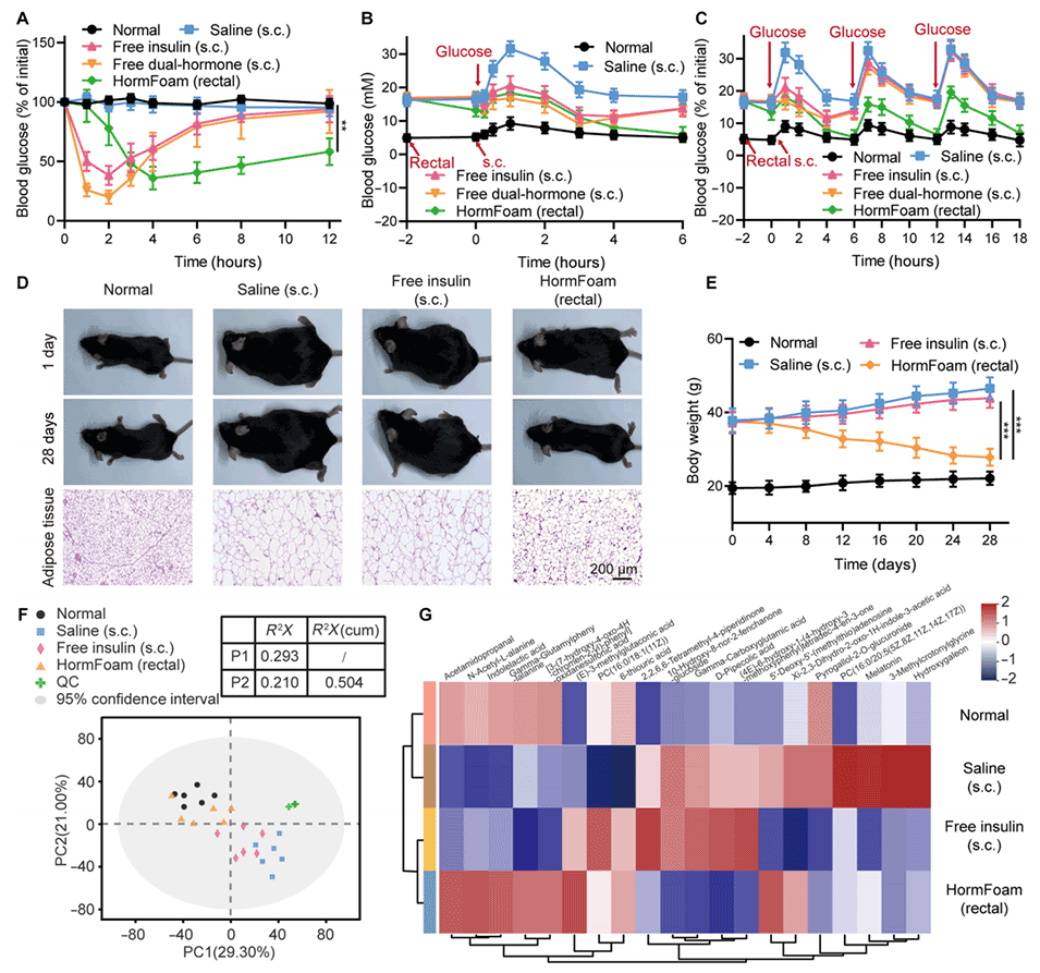1、开发了新型温度响应性双激素泡沫纳米引擎(HormFoam),并结合定制的喷雾装置构建了一种原位泡沫生成系统,用于提高胰岛素和普兰林肽的直肠生物利用度。