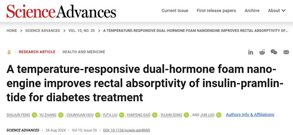 近期,南京理工大学罗军教授、南京大学宋玉君教授、南京大学/皖南医学院高彦峰博士和南京理工大学张宇博士合作,采用微流控技术制备了一种新型温度响应性双激素泡沫纳米引擎(HormFoam),并与定制的喷雾装置结合,用于改善直肠给药胰岛素和普兰林肽(一种胰淀素类似物)的生物利用度,以治疗糖尿病。相关研究以“A temperature-responsive dual-hormone foam nanoengine improves rectal absorptivity of insulin-pramlintide for diabetes treatment”为题目,发表在期刊《Science Advances》上。