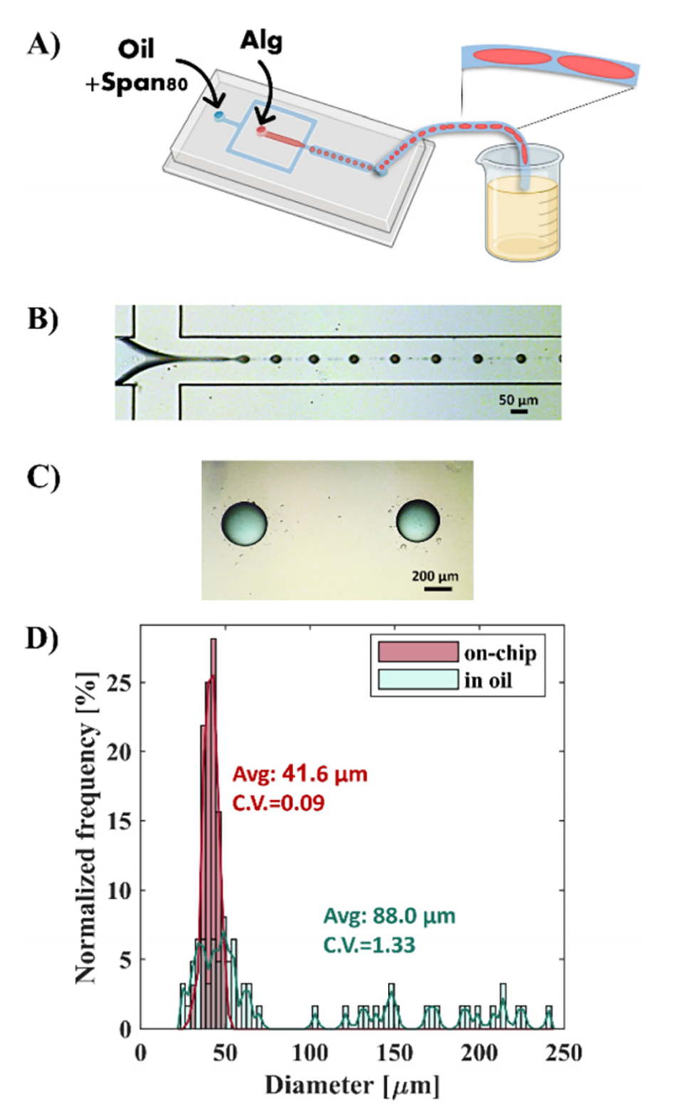 3、采用微流体设备生成的海藻酸盐液滴在冷却的出口管中迅速凝胶化,从而固定了液滴的尺寸和形状。