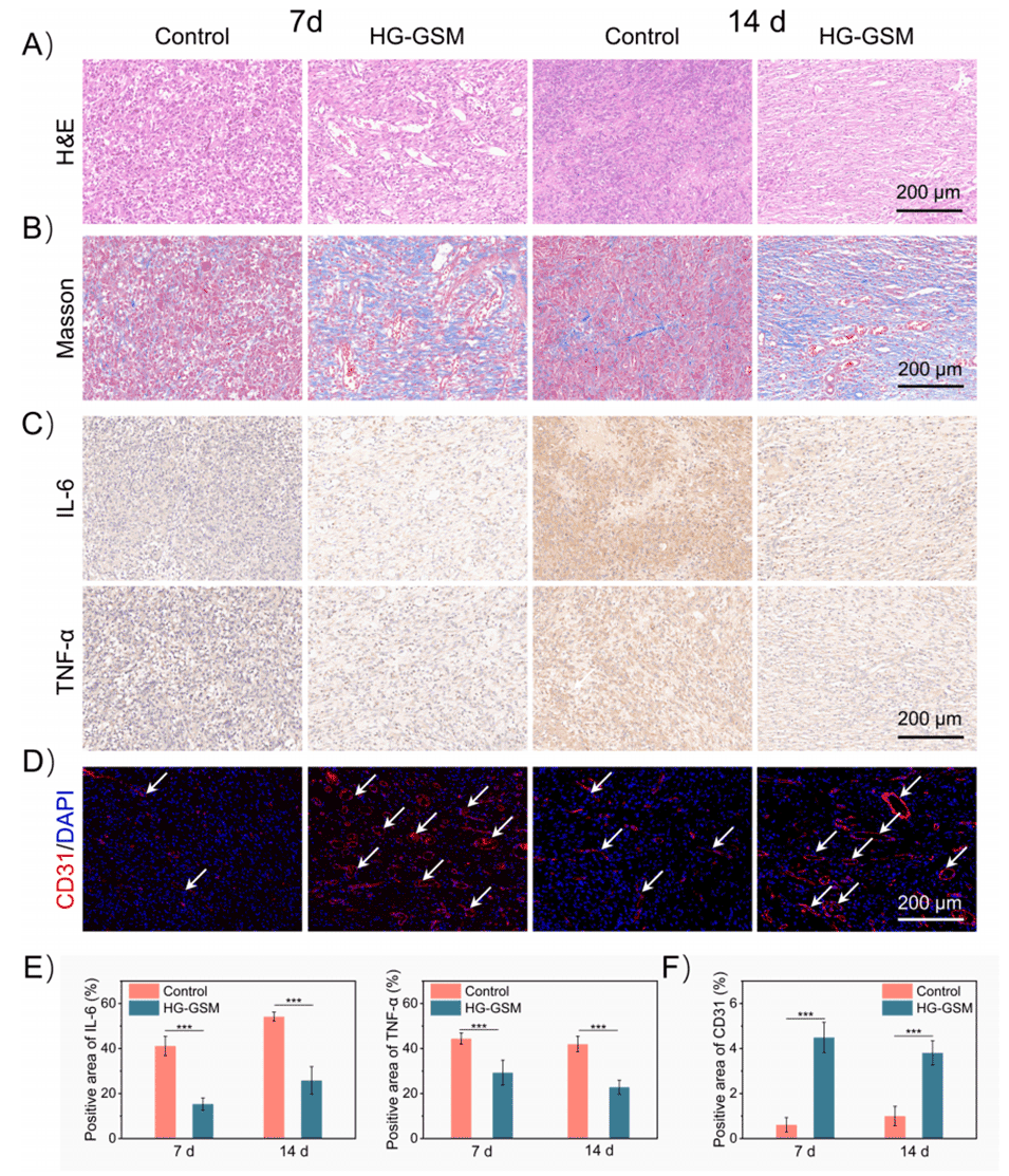 5、促进血管生成和胶原沉积:MSC-GSM@HG平台能够有效促进血管生成和胶原沉积,这对于组织修复至关重要,进一步支持了干细胞的有效性。