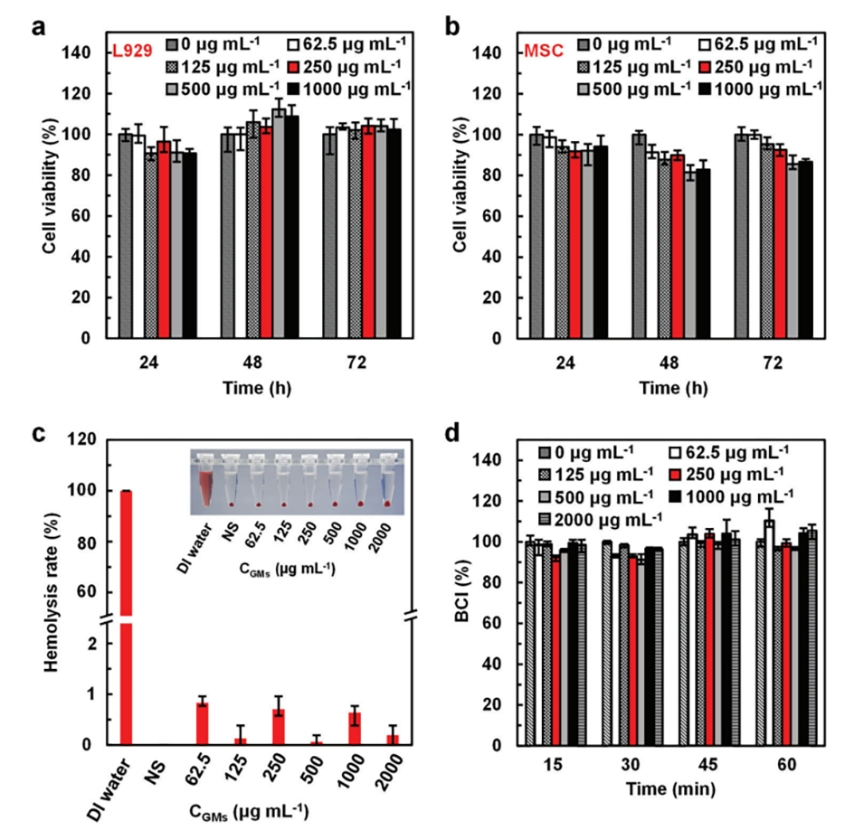 图5.GMs的体外生物相容性:a)L929细胞和b)MSC细胞与不同浓度GMs共孵育后的存活率。c)GMs的溶血率。d)GMs的BCI。