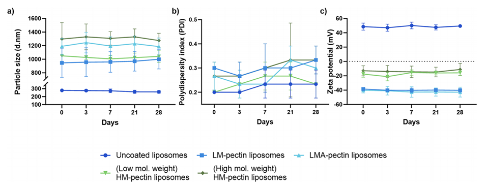 3、结果表明,涂层脂质体的粒径至少是未涂层脂质体的三倍,表面电荷转变为强负电荷,表明果胶已完全覆盖颗粒。