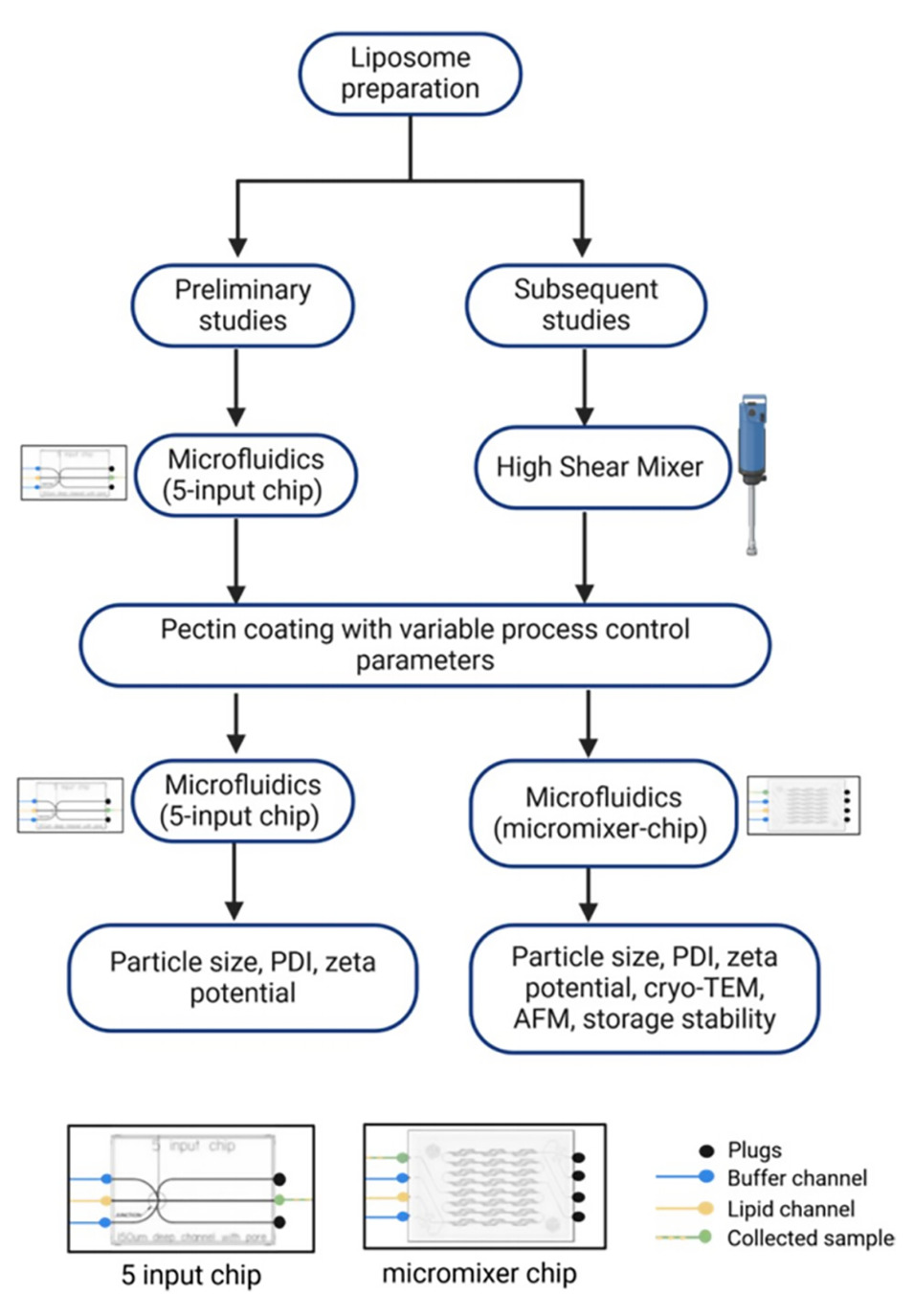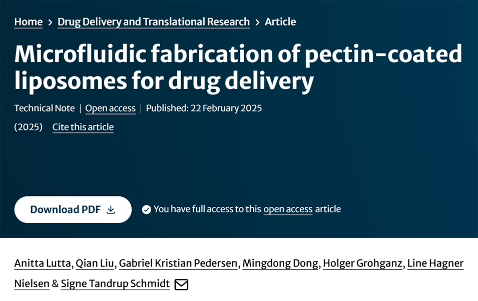 脂质体因其多功能性、生物相容性和生物可降解性,成为药物递送领域中研究最为广泛的纳米载体之一。近期,有研究人员利用微流控技术制备了果胶涂层阳离子脂质体,通过优化果胶/脂质体重量比和流速比等关键参数,实现了均匀包覆,显著提升了其稳定性和粒径均一性,为口服药物递送系统提供了高效、稳定的新型载体。相关研究以“Microfluidic fabrication of pectincoated liposomes for drug delivery”为题发表于期刊《Drug Delivery and Translational Research》上。