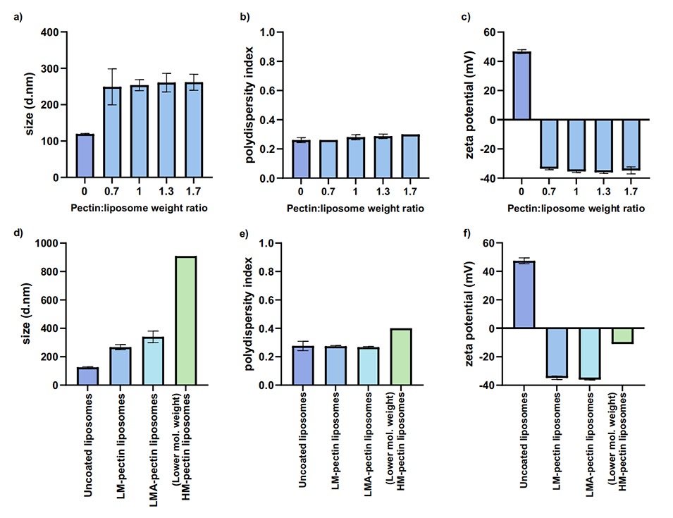 图2.初步研究后果胶包覆脂质体的表征。微流体制备阳离子脂质体,脂质浓度为2.5:0.5 mg/ml DDA:MMG。果胶的起始浓度为1mg/mL,用5个入口的微芯片制备果胶包覆脂质体,其中2个入口被堵塞。a-f)显示粒径、PDI和ζ电位表征。a-c)用LM果胶和不同果胶/脂质体比例制备的颗粒。d-f)用不同的果胶制备的颗粒。