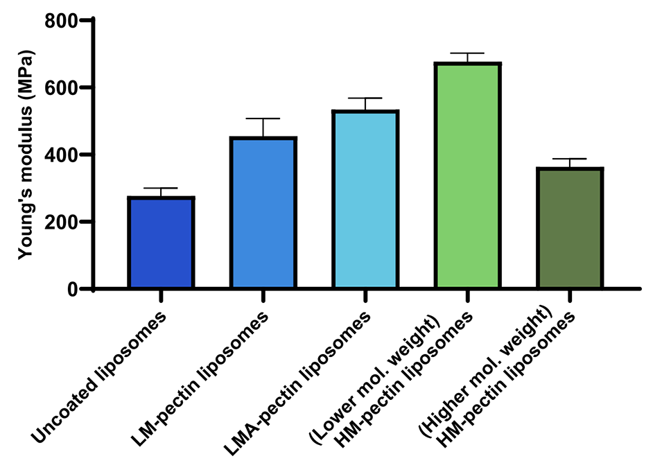 图5.AFM测量果胶包覆脂质体和未包覆脂质体后计算的杨氏模量变化。