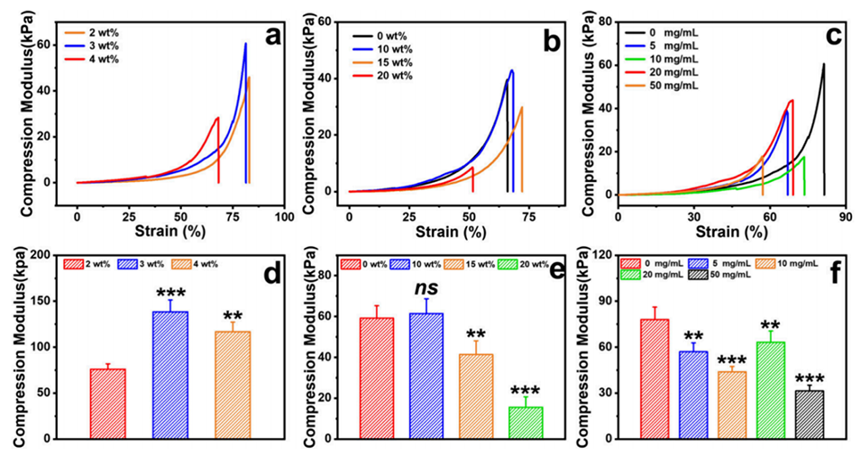图4.γ-PGA/HA热敏糖肽水凝胶的力学性能表征。a-c: 分别展示了γ-PGA/HA水凝胶、γ-PGA/HA/F127水凝胶和γ-PGA/HA/F127@PLLA微球复合水凝胶的应力-应变曲线。d-f: 分别展示了上述三种水凝胶的压缩模量,显示了不同成分对机械强度的影响。