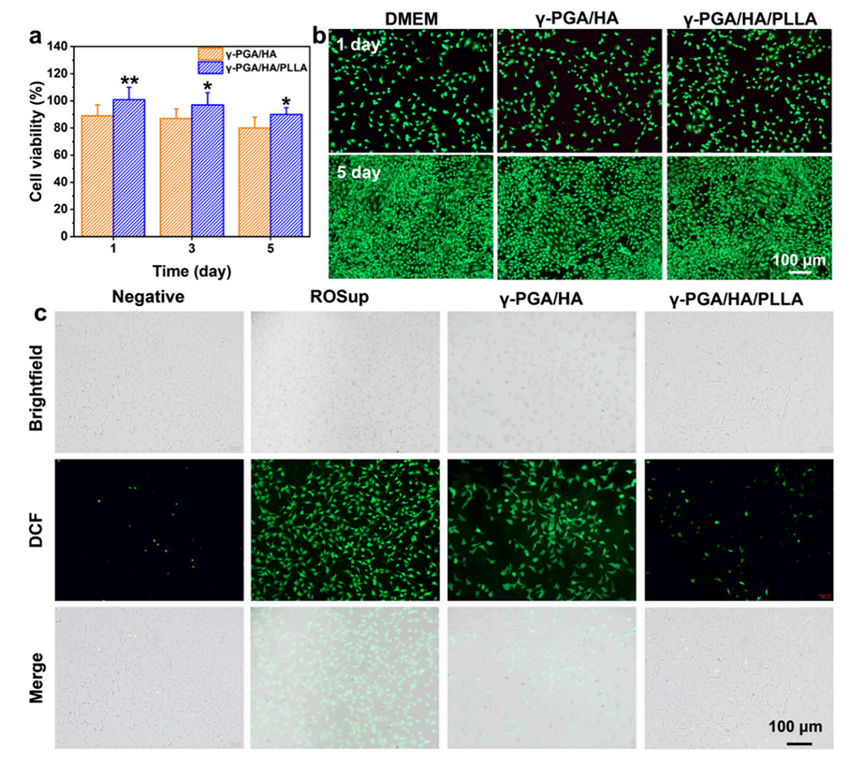 图8.γ-PGA/HA水凝胶的生物相容性与细胞内ROS清除能力评估。a: 展示了水凝胶的细胞存活率测试结果,表明水凝胶具有良好的生物相容性。b: 展示了水凝胶的活/死细胞染色实验结果,进一步证明了水凝胶对细胞生长的支持作用。c: 展示了水凝胶清除细胞内ROS的能力,证明了其对细胞的保护作用。