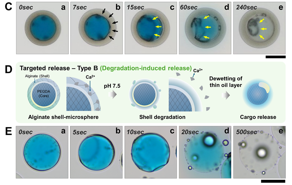 本研究展示了两种pH响应型释放机制:一种是通过聚丙烯酸(PAA)交联的PEGDA外壳在碱性条件下膨胀,导致油层破裂并释放药物;另一种是通过藻酸盐外壳在碱性条件下解离,从而释放药物。